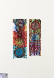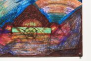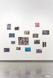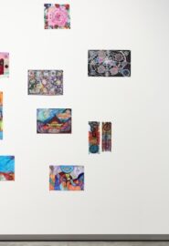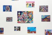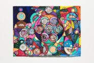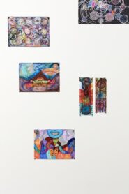 Saxon's passion for storytelling and performance is channelled through the series of celestial drawings she contributed to the exhibition. The collection, Cosmic mirror doors through space and time, layers lines and shapes to depict portals to the galaxy. By mixing materials such as markers, pencils and ink, each drawing is an entrancing kaleidoscope of bright and metallic colour.